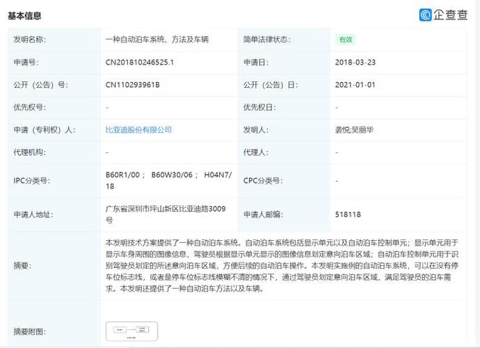 据企查查信息显示,近日,比亚迪被授权自动泊车相关专利,专利名为“一种自动泊车系统、方法及车辆”。专利摘要显示:本发明技术方案提供了一种自动泊车系统,本发明实施例的自动泊车系统,可以在没有停车位标志线,或者是停车位标志线模糊不清的情况下,通过驾驶员划定意向泊车区域,满足驾驶员的泊车需求。本发明还提供了一种自动泊车方法以及车辆。