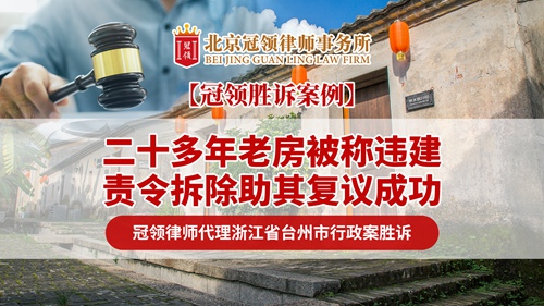 2024年12月31日,冠领发布《二十多年老房被称违建责令拆除助其复议成功冠领律师代理浙江省台州市行政案胜诉!》案例视频。委托人翻建老房后,新房被认定成违建,收到整改通知,委托冠领律师代理行政复议后,整改通知被撤销,住房免遭拆除。